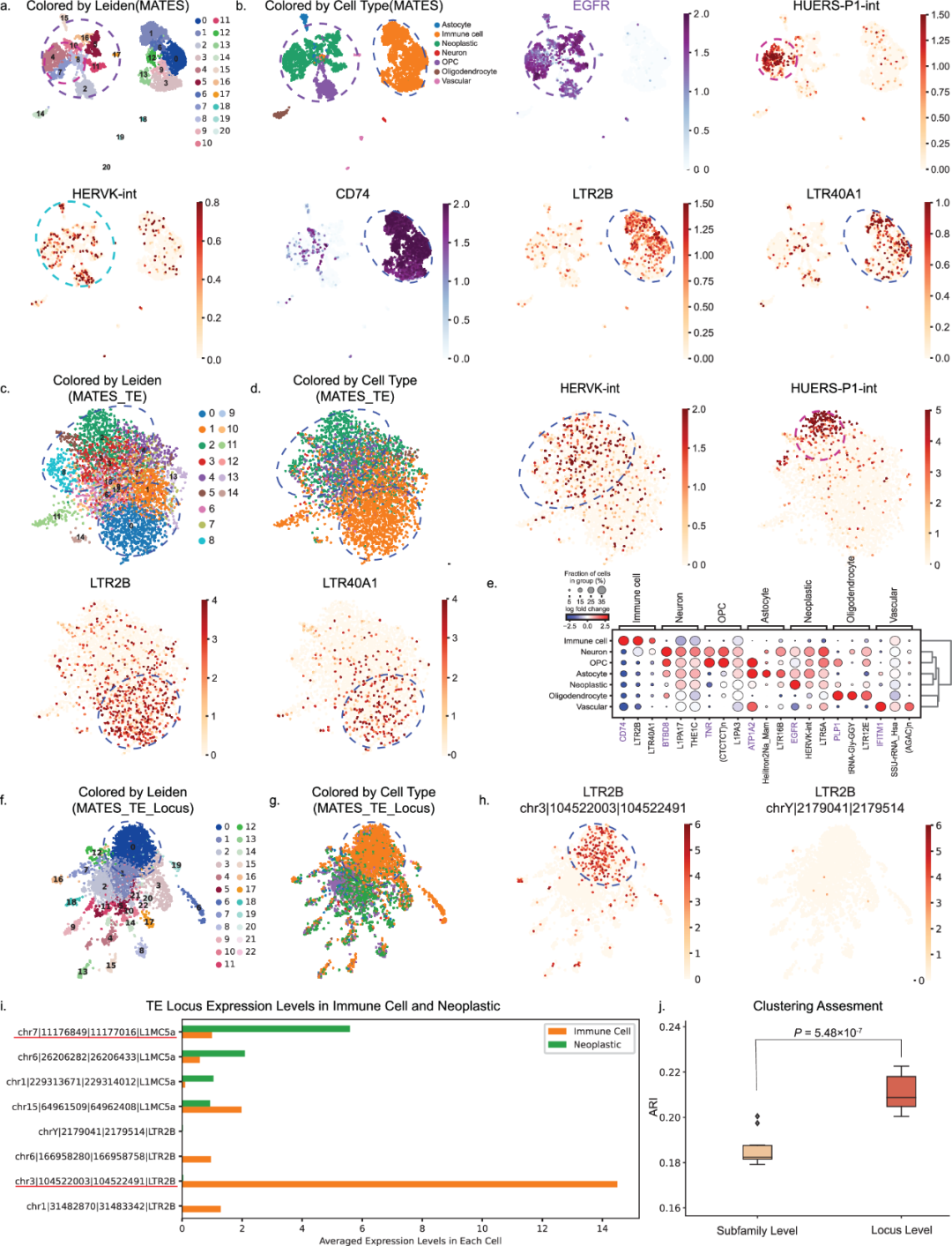 除了分析上述亚家族级别的TE表达外,MATES的位点级TE定量提供了更全面的细胞景观视图(图3f-h)。这种方法有助于识别出与之前在亚家族级别确定的标志性TE相对应的高表达TE位点。值得注意的是,即使是同一个TE亚家族,例如LTR2B,不同的位点也可能表现出不同的表达模式(图3h,i),这凸显了精确的位点特异性TE定量的重要性。