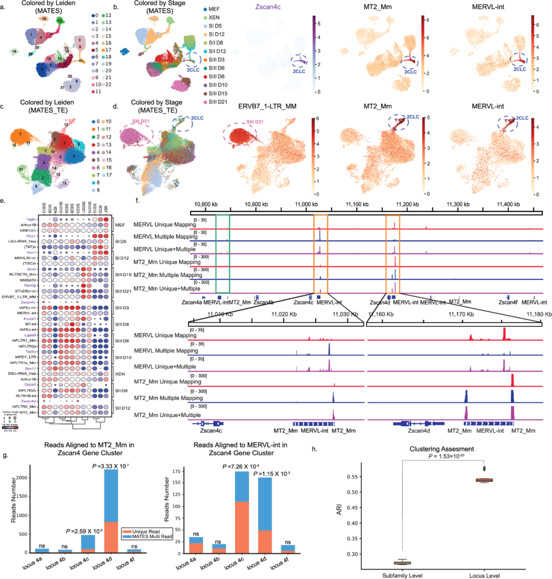 需要注意的是,图g中以橙色高亮显示的基于唯一读数的位点定量代表SoloTE策略。该策略在位点级别处理唯一读数,而多重比对读数则在亚家族级别处理。因此,SoloTE在位点级别只使用了唯一读数,这可能导致无法捕捉到像Zscan4c和Zscan4d这样重要位点的读数,揭示了其潜在的局限性。此外,与通常用于现有方法的亚家族级别TE定量相比,位点特异的TE定量显著提高了聚类的准确性,这在图2h中得到了清晰展示,强调了精确的位点级TE定量的巨大优势。有关更多展示MATES在这10x单细胞RNA-seq数据中有效性的结果,请参见补充图S1。