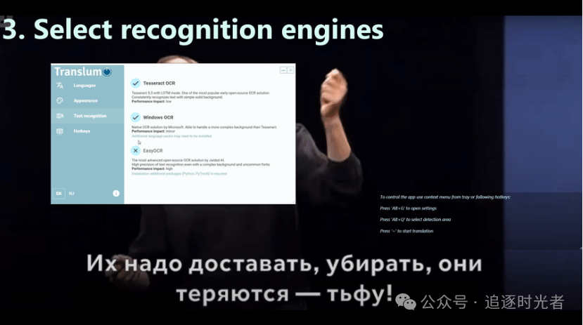 Translumo是一个.NET开源的高级屏幕翻译工具,能够实时检测和翻译选定区域内的文本(如字幕)。Translumo 允许同时组合使用多个 OCR 引擎。它使用机器学习训练模型通过 OCR 对每个识别的结果进行评分,并选择最佳结果。