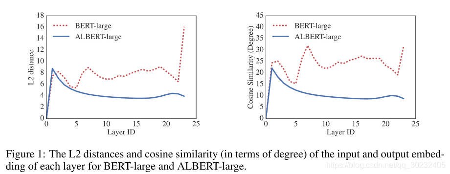 在交叉层中使用了参数共享操作,可以看到层与层之间的距离相似。在上图中ALBERT的层间距离是收敛的,不是震荡状态。