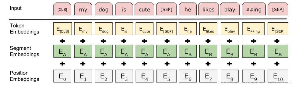(1)Token embedding:句子中每个词语的词向量输入,使用了wordpiece方法。CLS和SEP代表的是输入句子的开头和结尾;SEP则分割了两个输入句子