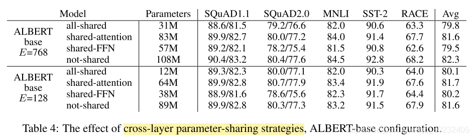 -如果全部的层都进行参数共享,参数量会变得很少,但模型的效果不会降低太多。