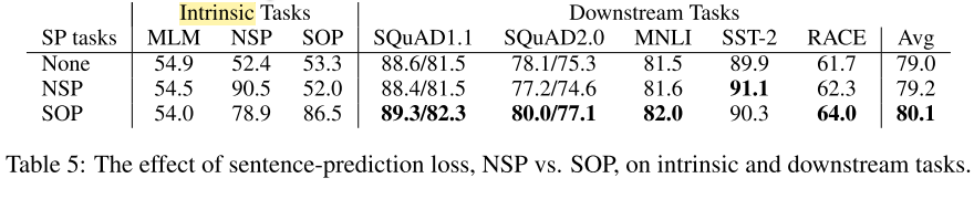 ALBERT还提出了另一种方法,用来代替NSP技术,这种新技术叫sentence-order prediction (SOP)。SOP是一种self-supervised loss。