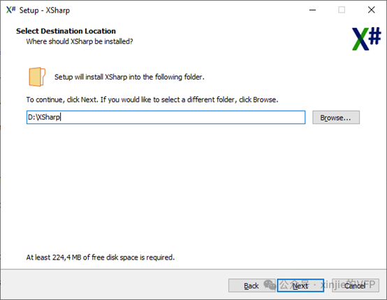 确认安装目录为 C:\Program Files (x86)\XSharp 或选择其他目录,然后选择下一步继续。