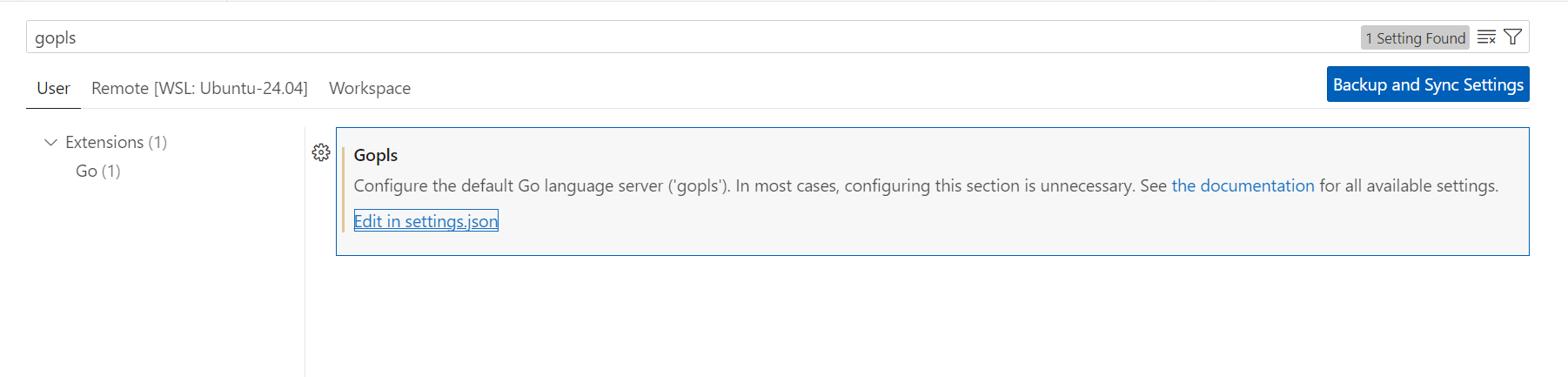 在设置搜索栏中输入 gopls,你会看到与 gopls 相关的配置选项。