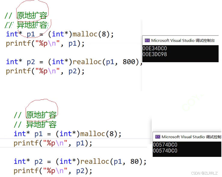 如果要扩的空间不大,在已有空间接下来的地址够用或者可用,就会使用接下来的地址扩大原空间,这个过程原空间地址不变只是单纯申请空间扩大。一但接下来的空间不可用或者不够,realloc就会另寻一块足够大的可用地址申请空间(地址改变),之后将原空间中数据复制过来,并释放原空间。显而易见的,异地扩容的消耗较大。