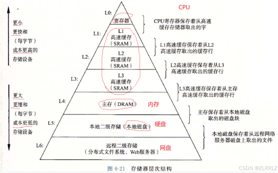 如上图,为我们电脑中存储体系,一般来说我们接触最多的是主存(即内存)和本地磁盘(磁盘或者叫做外存),两者的区别在于内存是带电存储,速度快,但是空间相对较小,8G、16G等;而磁盘是不带电存储,速度慢,但是空间大,可以达到几百G及以上。所谓带电与不带电存储是指程序运行时数据主要在内存上,如果此时断电,数据都会丢失,如果我们按保存,文件就会被保存到硬盘上,这样即使断电,数据也会保留下来。
