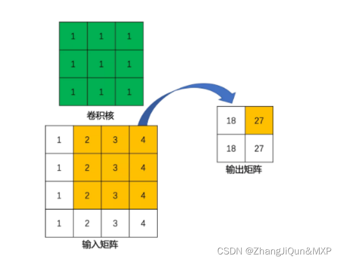 在上例中,输入矩阵右上角 3×3 范围的值 (黄色 2 3 4) 会影响 输出矩阵右上角的值 (黄色 27),这其实也对应了标准卷积中感受野的概念。所以,可以说 3×3 标准卷积核 建立了 输入矩阵中 9 个值 到 输出矩阵中 1 个值 的映射关系。