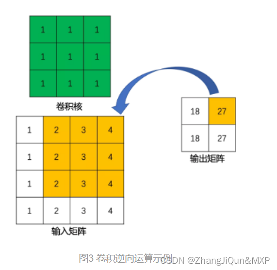 当然,从信息论的角度上看,常规卷积操作是不可逆的,所以转置卷积并不是通过输出矩阵和卷积核计算原始输入矩阵,而是计算得到保持了相对位置关系的矩阵。