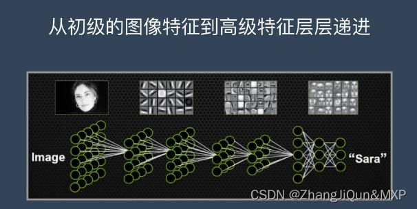 机器的方法也是类似:构造多层的神经网络,较低层的识别初级的图像特征,若干底层特征组成更上一层特征,最终通过多个层级的组合,最终在顶层做出分类。