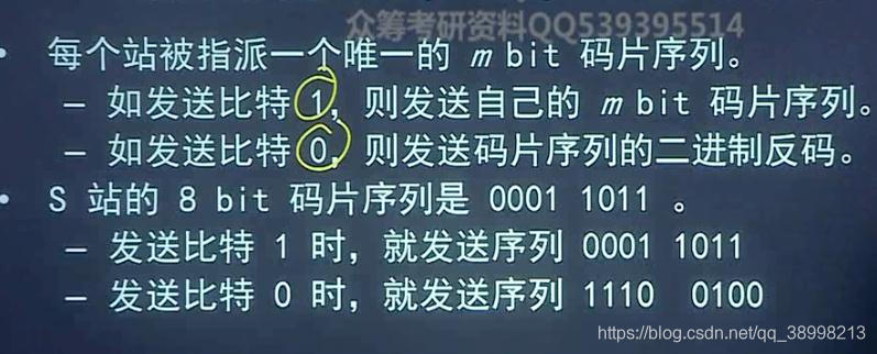 使用CDMA时的每一个站被指派一个惟一的m bit码片序列(chip sequence),一个站如果想要发送比特1.则发送它自己的m bit码片序列,如果要发送0,则发送其码片序列的反码.同时各个站之间的码片序列相互正交。