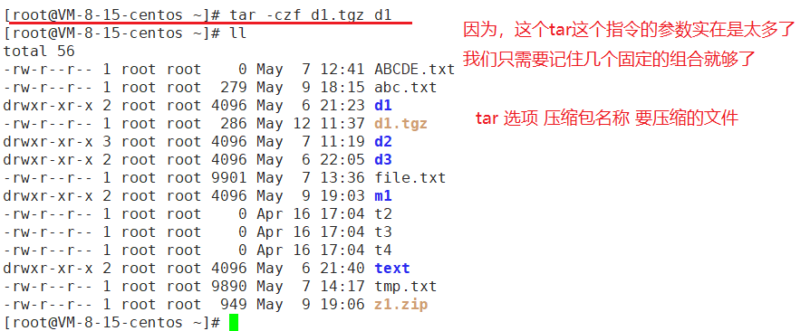 参数解析:c:就表示创建一个新的压缩包(属于打包,没有压缩) z:就大白话来讲就是,打包的时候随便压缩 f:表示指定新的压缩的名称