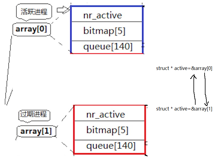 这里有两个进程,一开始CPU都是从活跃进程里面拿进程进行运算,然后此时即使有新的进程进来也不会被加到活跃进程上,而是会全部被加到过期进程上。当活跃进程里的进程全部被加载完了。此时进行进程互换,活跃进程变成过期进程,过期进程变成活跃进程。