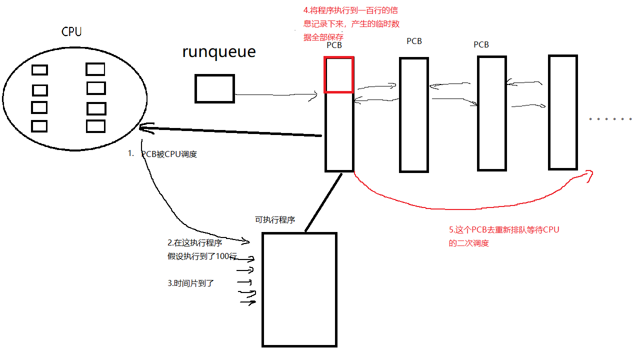 PCB在CPU运行队列里排队,当PCB被CPU调度的时候,可执行程序在CPU内部执行。 进程在CPU里运行的时候,会产生大量的临时数据(我们将这些临时数据称之为进程的硬件的上下文),如果,这个程序在时间片内运行完了,那就直接从CPU里带出结果就行了,但是,如果这个程序没有在时间片内在CPU内部运行结束,需要等待CPU的二次调度,那么这些临时数据就显得格外重要(总不能直接删掉,让CPU重新计算,那不就一直无法结束了吗)