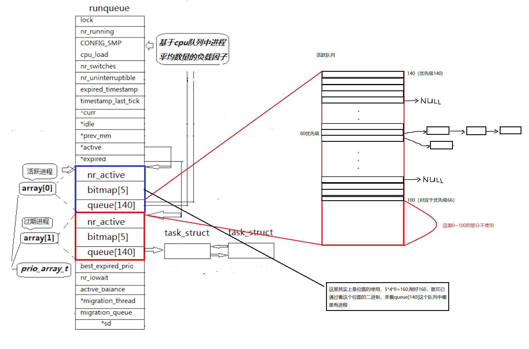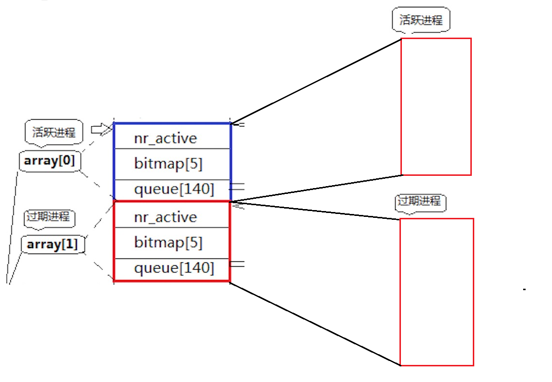 我们看到这里就发现好像,如果一直往运行队列中加入优先级高的进程,那么那些优先级低的进程还是依旧无法被分配到cpu资源。这样好像进程饥饿的问题没有被解决,所以接着将过期进程,这就是过期进程的作用。