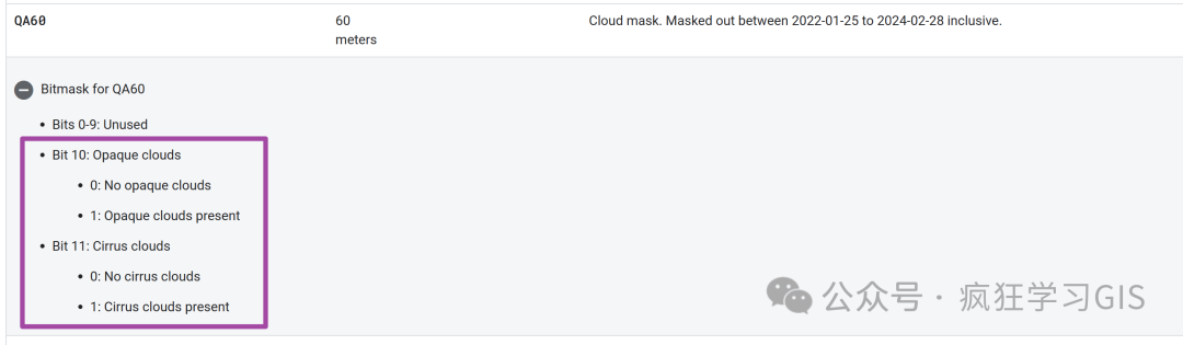 在这里,之所以选用质量评估波段 QA60的第10位和第11位,是因为在Sentinel-2的地表反射率图像产品中,这两位就是分别表示有无云和卷云的比特位;如下图所示,在GEE的产品介绍中,就会有对其波段含义的详细介绍。如果大家用了其他的遥感影像产品,并且也需要做云掩膜,那就参考自己所用产品的介绍即可。