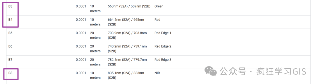 在这里,具体遥感影像的哪一个波段分别表示哪一个波长,我们也可以在GEE的产品介绍中找到,如下图所示。