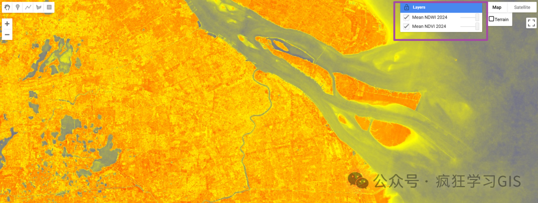 再接下来,Map.centerObject(shanghai_coords, 10)表示将地图中心定位到上海地区,缩放级别为10,并通过Map.addLayer(...)在地图上添加图层,显示NDVI和NDWI的年度平均值。这里的{min: -1, max: 1, palette: [...]}是设置颜色调色板,以可视化不同的指数值。可视化结果如下图所示。