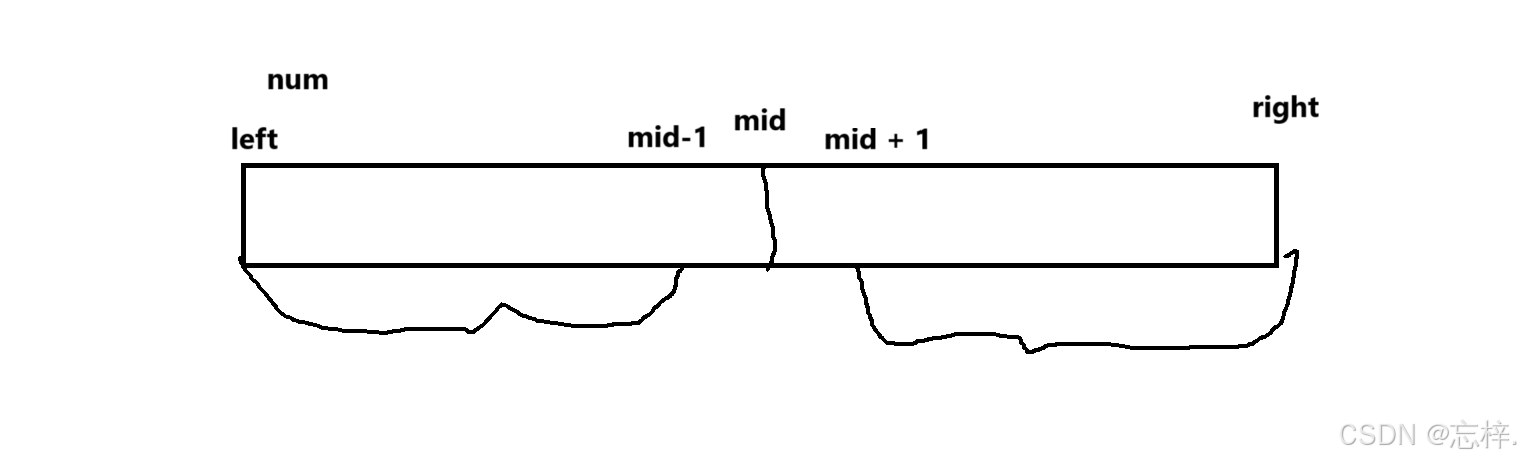 此时我们需要借助两个“指针”,来代表区间的首尾,一个指针指向数组的开头,用left表示;另一个指针指向数组的末尾,用right表示;之后我们需要先找到中间结点的位置,具体运算公式小编在上面体现出来了,这里我就不多说了,然后我们可以划分出两个区间: