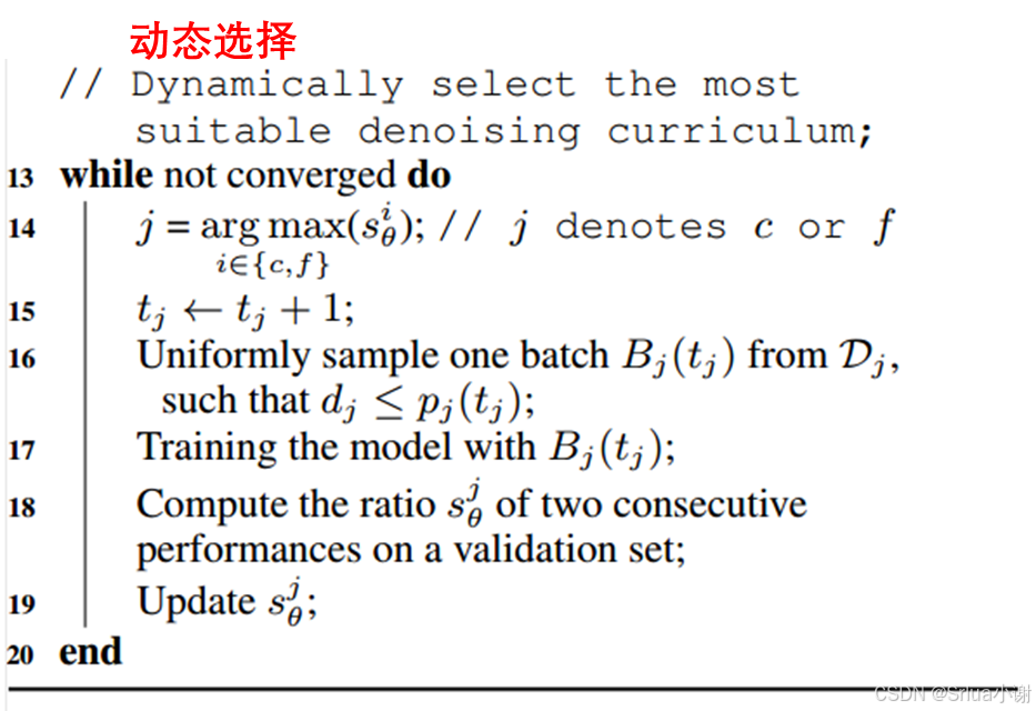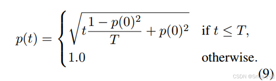 其中p(0)为预定初始值,设为0.01,T为去噪过程的持续时间。在时间步长t处,p(t)表示噪声度量的上限,模型只允许使用噪声度量dc或df小于p(t)的训练实例。