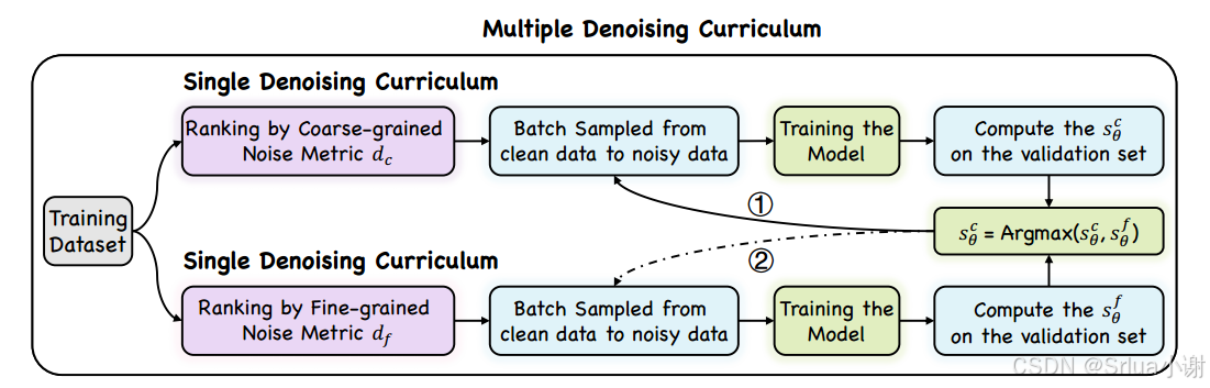实线①表示当前训练步骤选择粗粒度去噪课程,虚线②表示未选择粗粒度去噪课程。