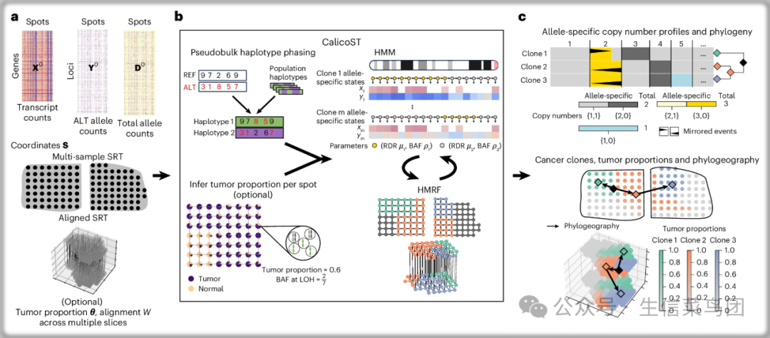 Fig. 1: CalicoST infers allele-specific copy numbers and a phylogeography of a tumor from one or more SRT samples from the same patient.