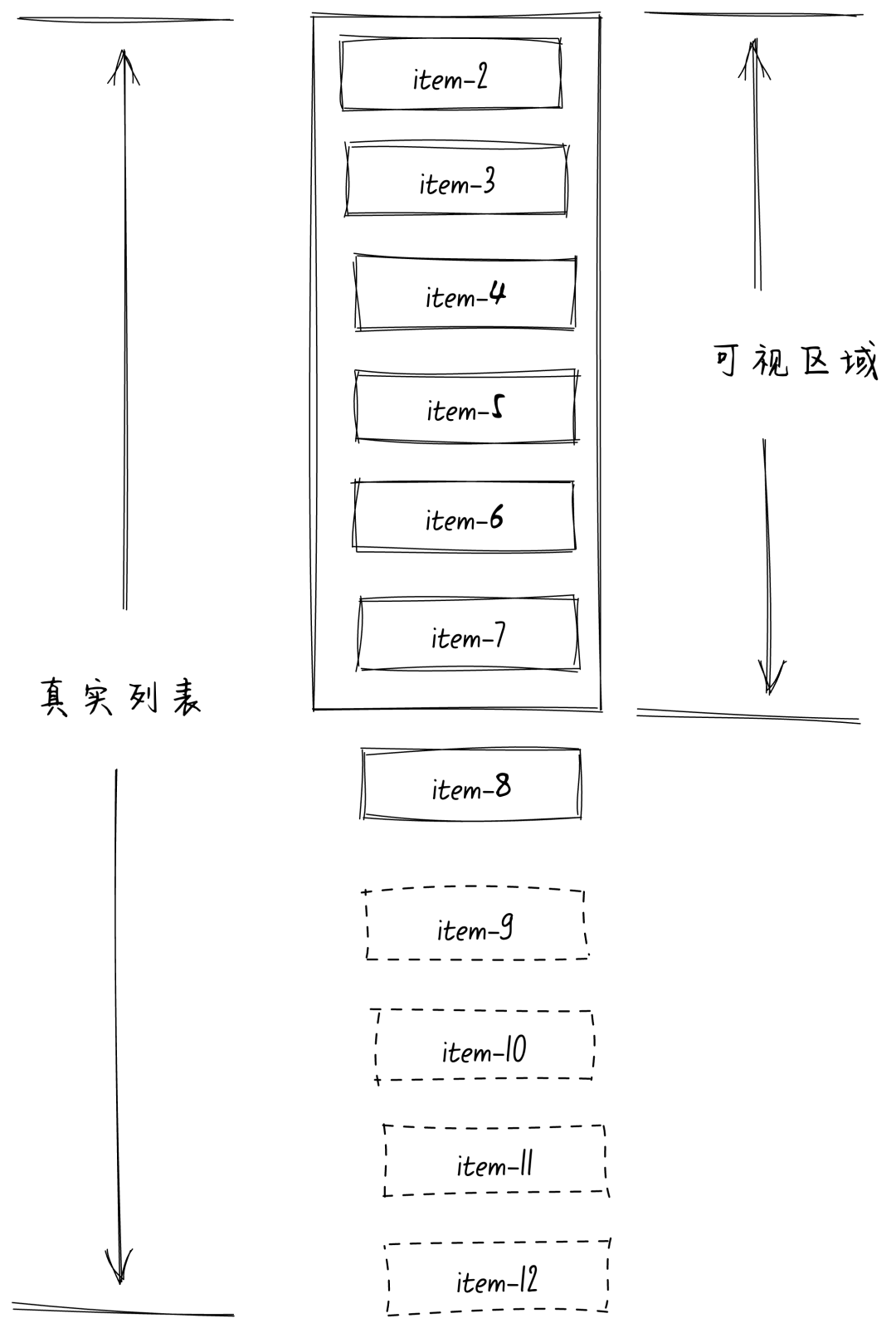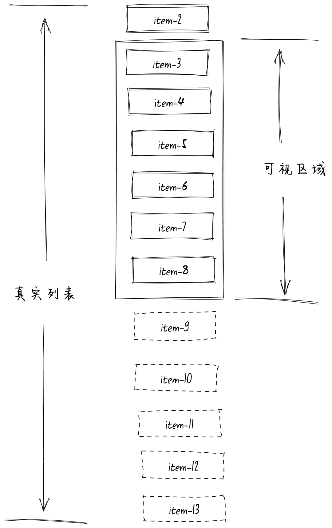 其中实线框的item表示在视口区域内真实渲染DOM,虚线框的item表示并没有渲染的DOM。