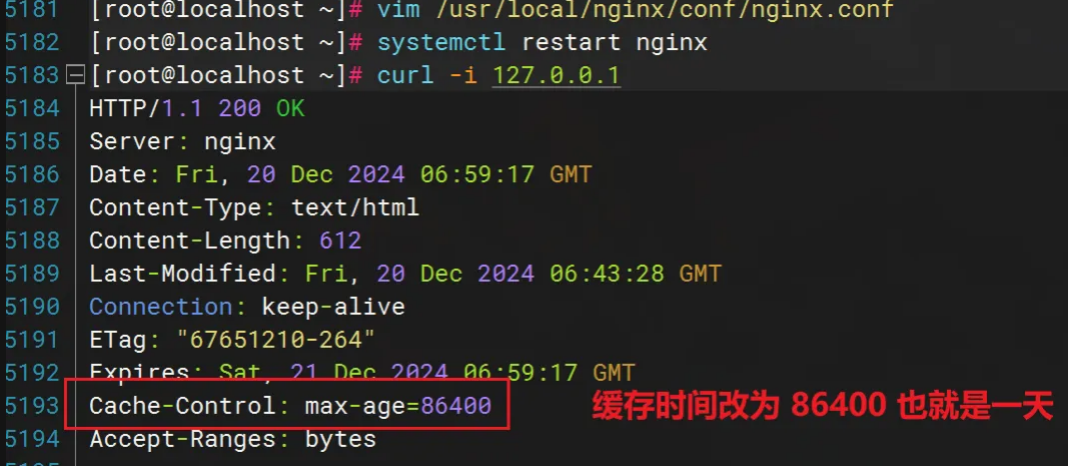再次运行相同的 curl 命令,检查是否返回相同的缓存参数。如果配置正确,浏览器或客户端将在缓存有效期内直接使用缓存数据,而不会重复请求服务器。