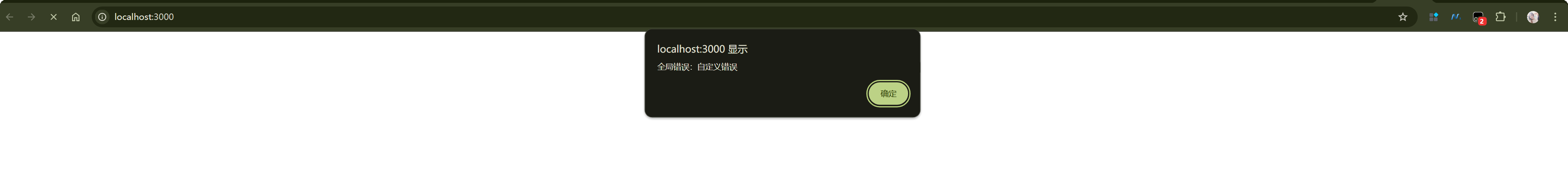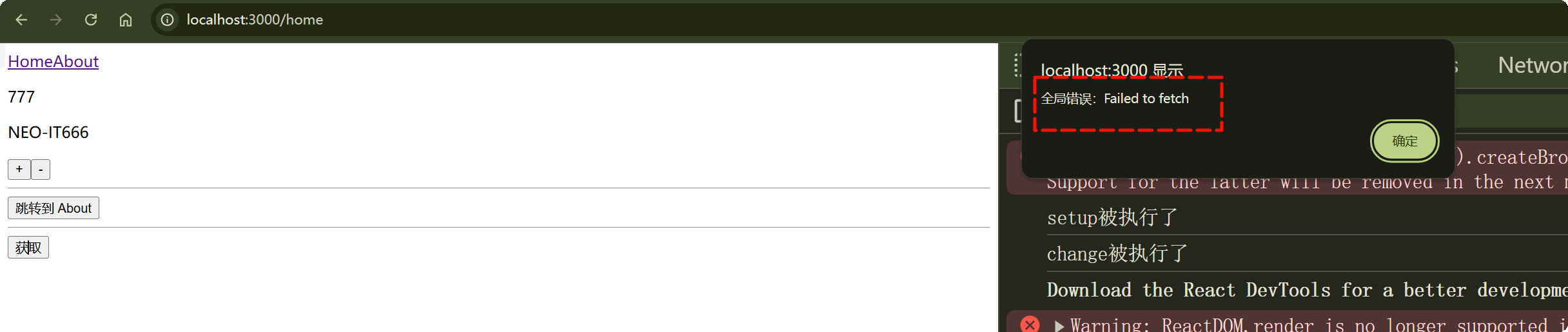 这样就会在 onError 中捕获错误,然后访问页面,点击获取按钮,这会发现页面上弹出了一个提示框,提示框中显示了错误信息,说明我们通过 onError 成功捕获了全局错误。