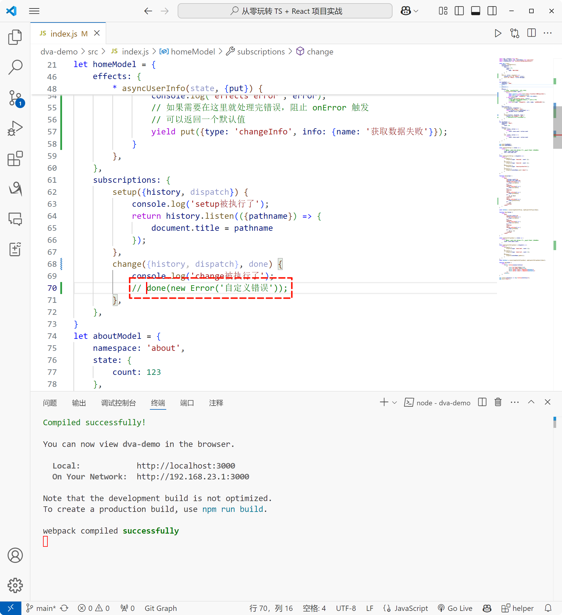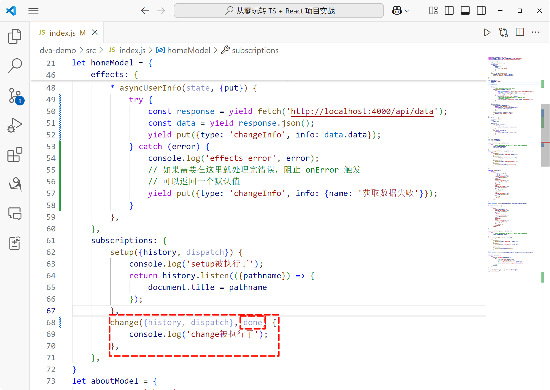 找到 homeModel 中的 subscriptions,这里有一个 setup 方法,这个方法除了接受一个对象之外,还传递了一个 done,这个 done 是一个回调函数,我就不在 setup 中使用 done,找到 change 因为这个方法没有做任何事情比较好看,在 change 接收 done:
