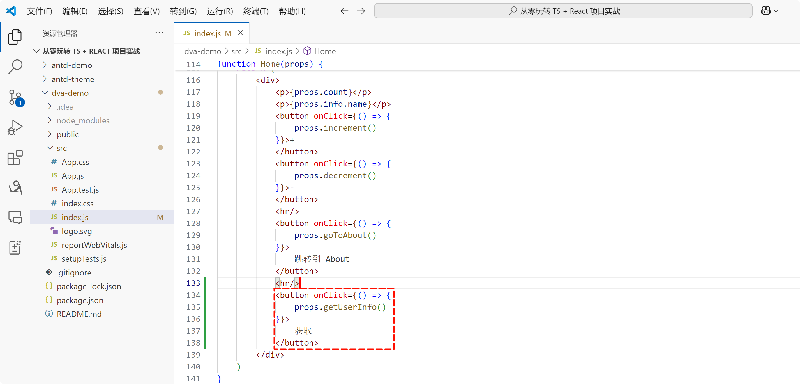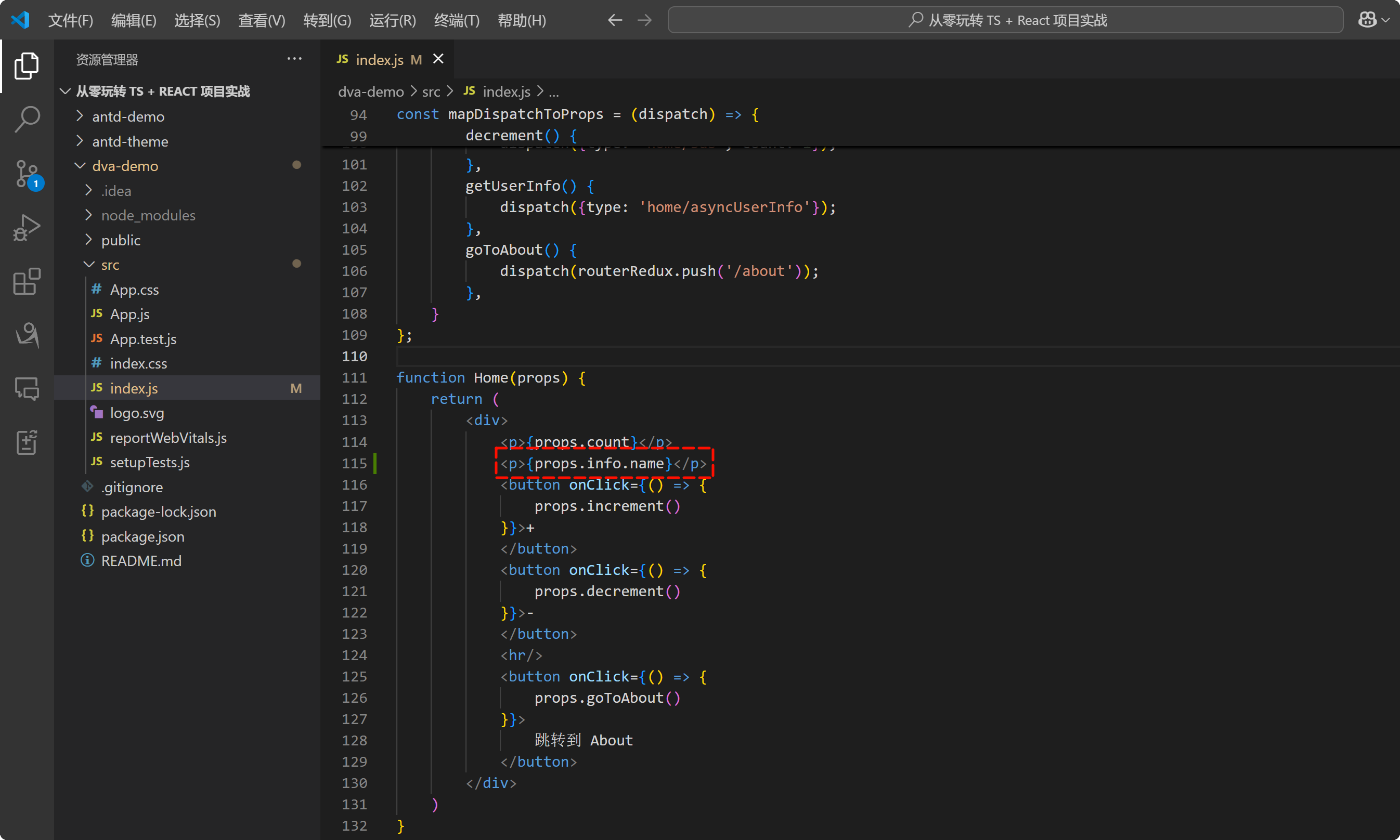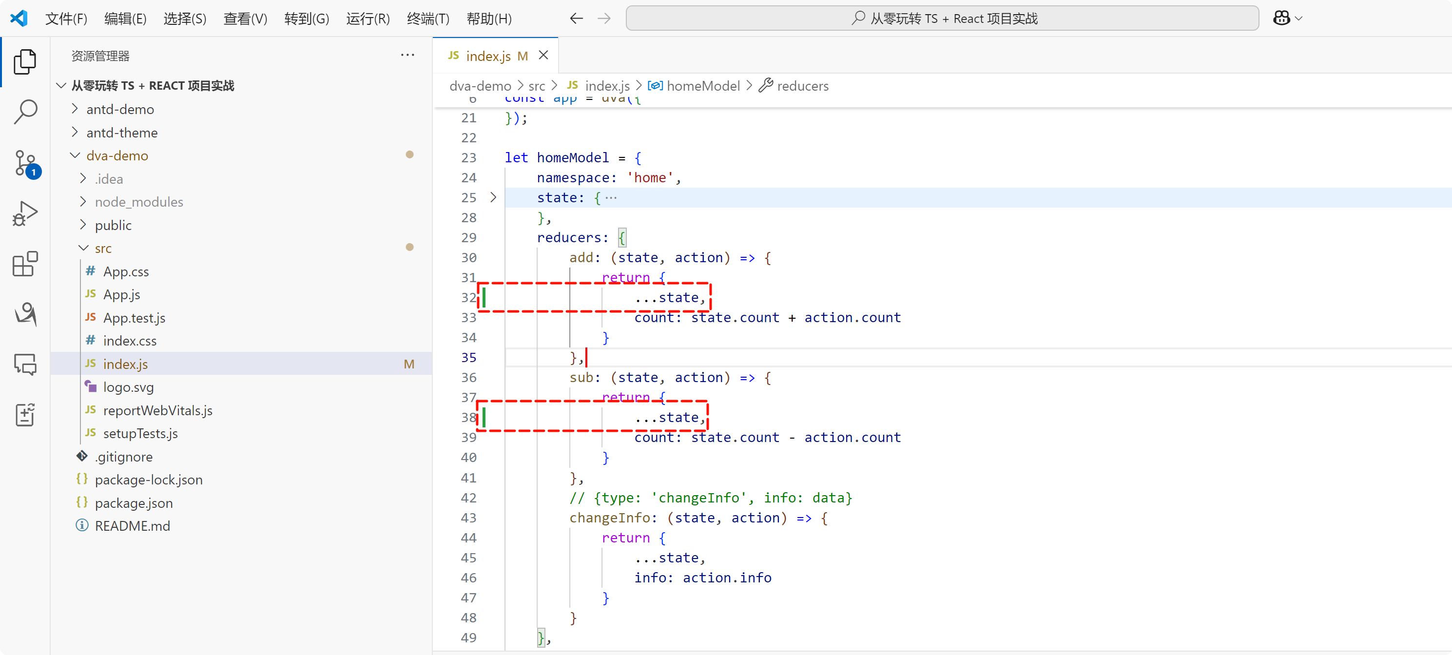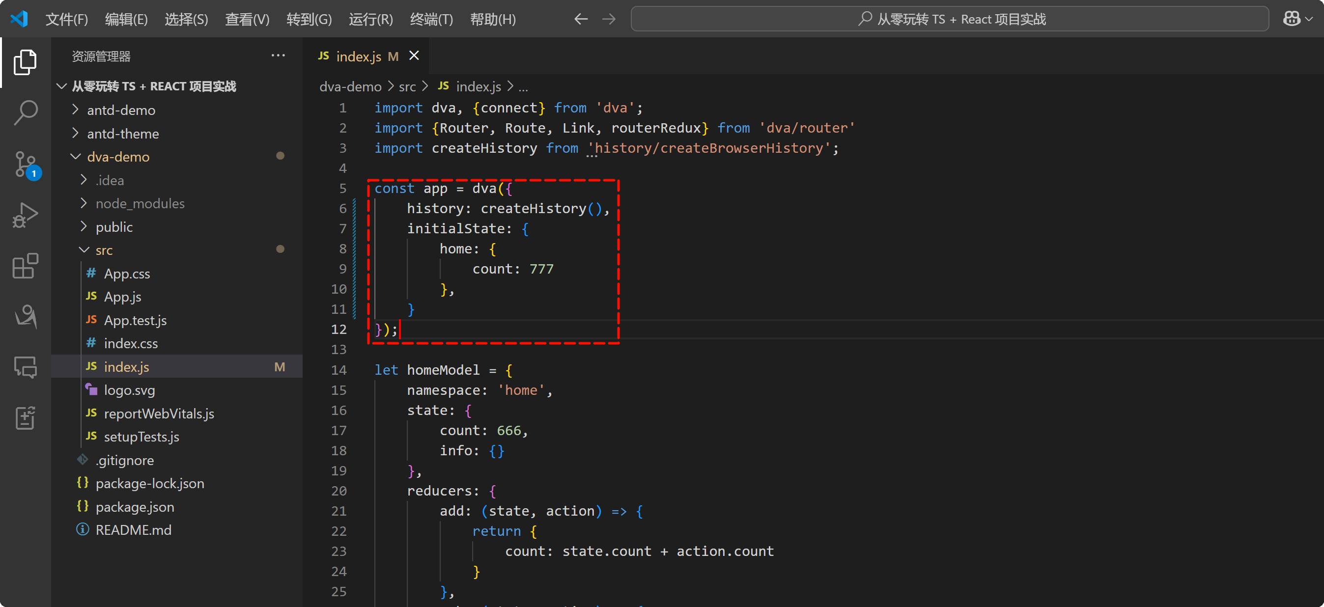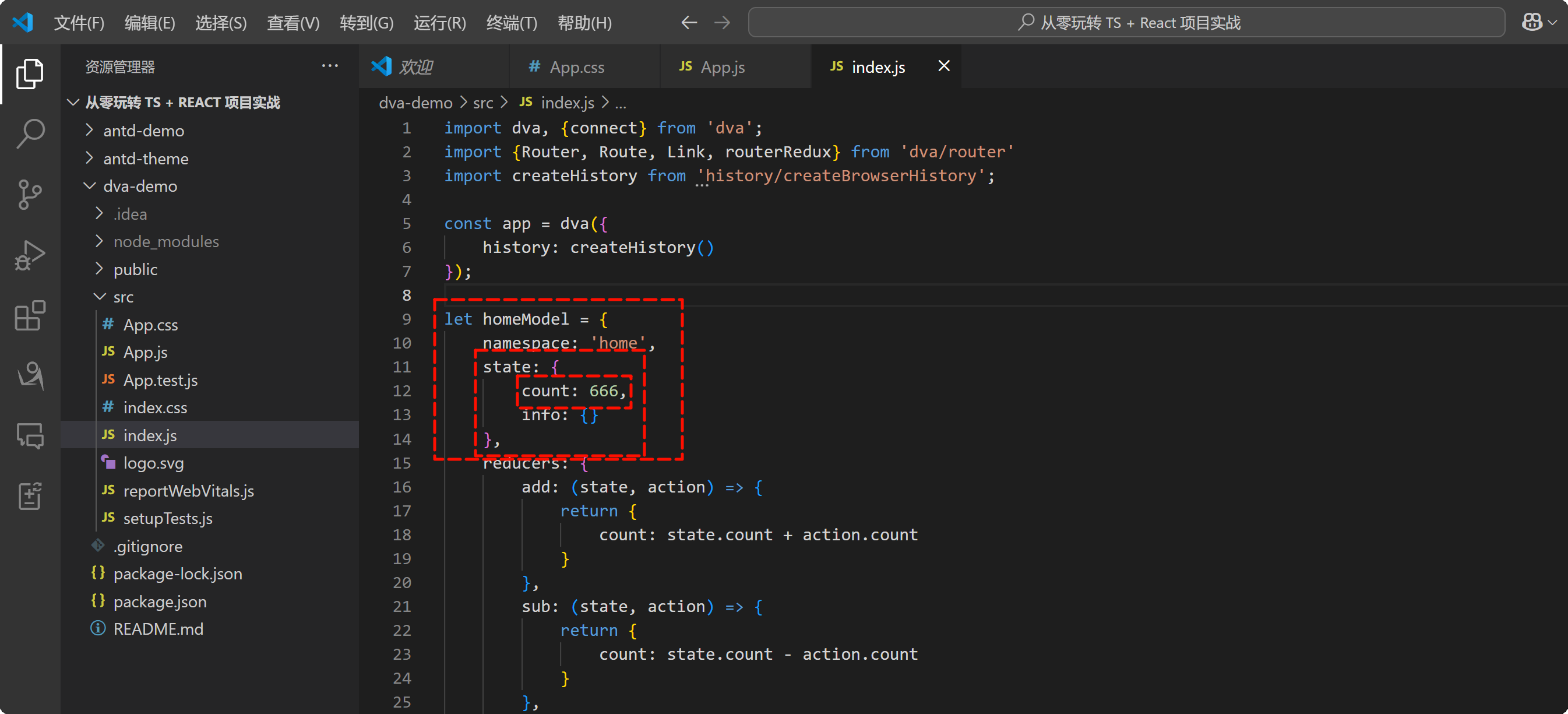 找到项目的 index.js 文件当中有一个 homeModel,在 homeModel 中的 state 当中有一个 count,值为 666: