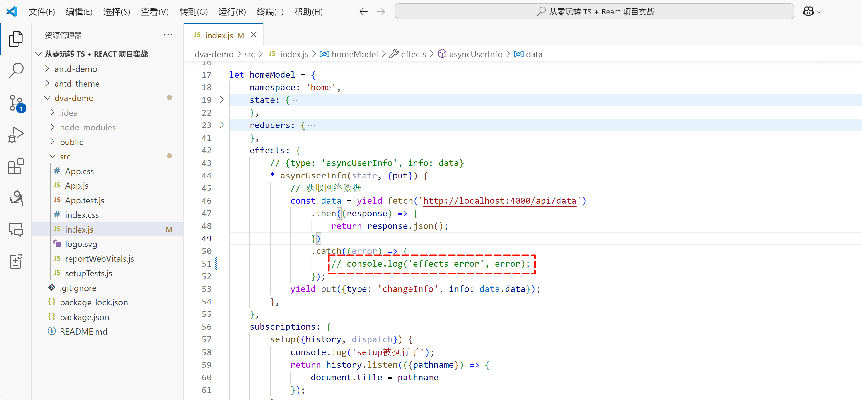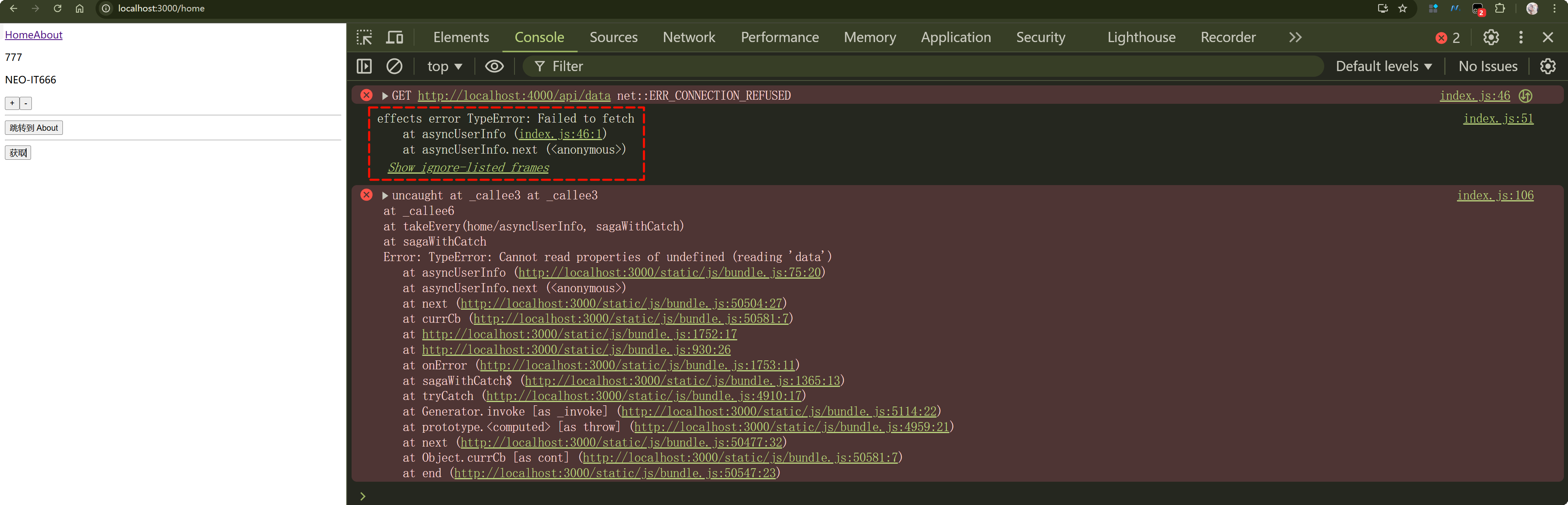首先来看一下在 effects 中发生错误的情况,我在 effects 中故意写一个错误的代码即可演示,在 homeModel 中的 effects 中有一个 *asyncUserInfo 方法,这个方法中有一个请求后端服务器的部分,那么我直接将后端服务停了,那么当我请求服务器的时候,如果请求服务器请求不到数据,是不是就会发生错误。easy~