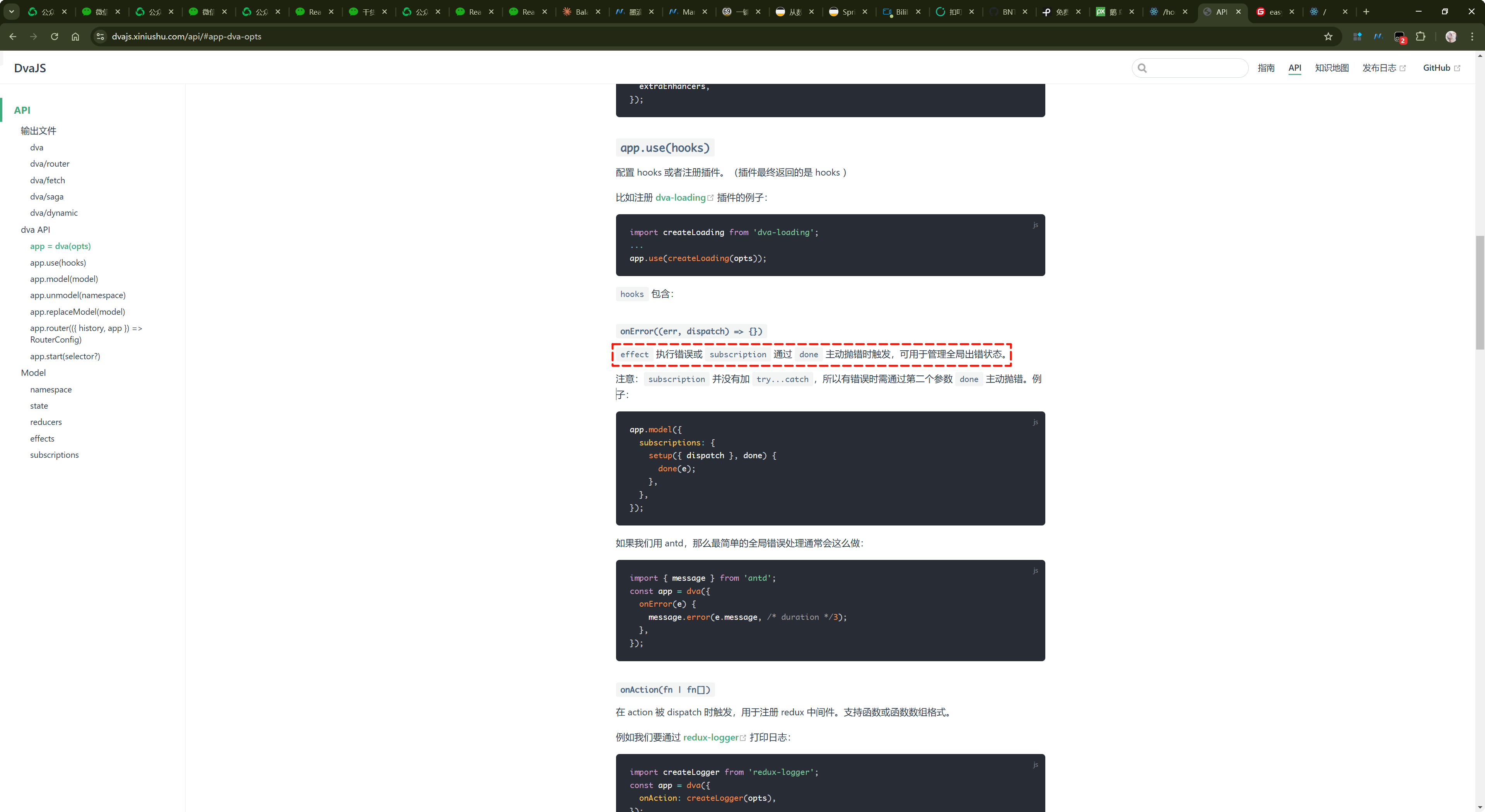 关于 onError 的使用,在官方文档中也是有详细的介绍的,大家可以去查看:https://dvajs.xiniushu.com/api/#app-dva-opts
