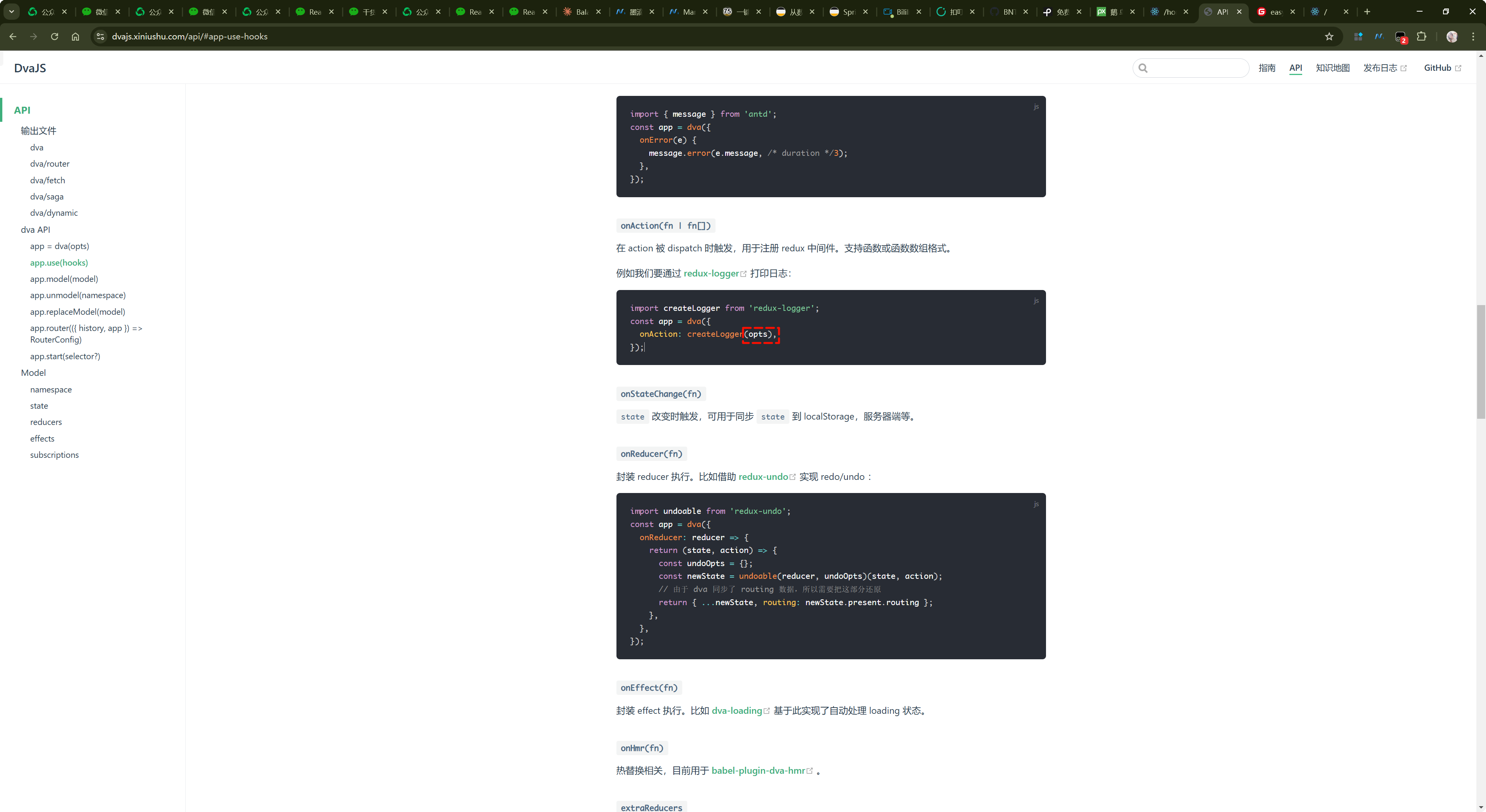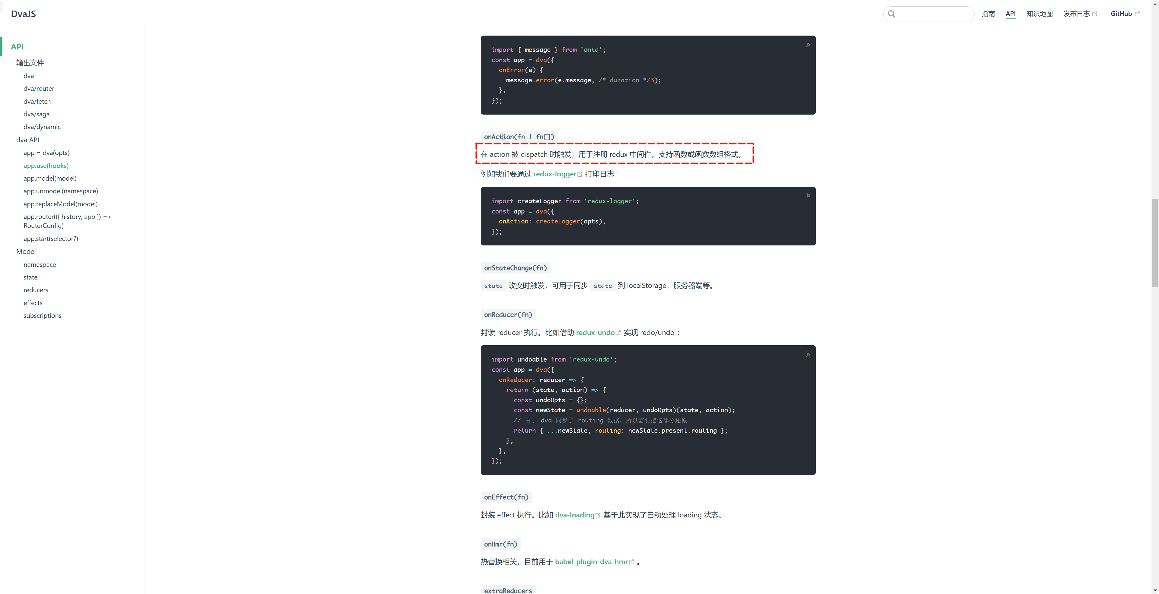 onAction 的作用:用来注册中间件的,比如说官网里面就有一个很好案例,它呢注册了一个打印日志的中间件,redux-logger,这个中间件是需要安装的,只需要 npm install 安装下即可。