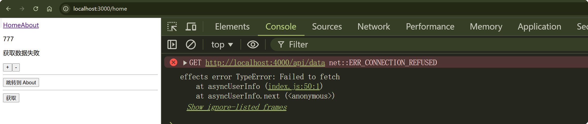 非常的简单,Dispatch 中已经存在 getUserInfo 了这个我就不贴了,没有的大家可以去翻阅我之前的文章,然后点击获取按钮,然后看一下控制台,这回肯定是请求不到数据的,因为我关掉了服务器: