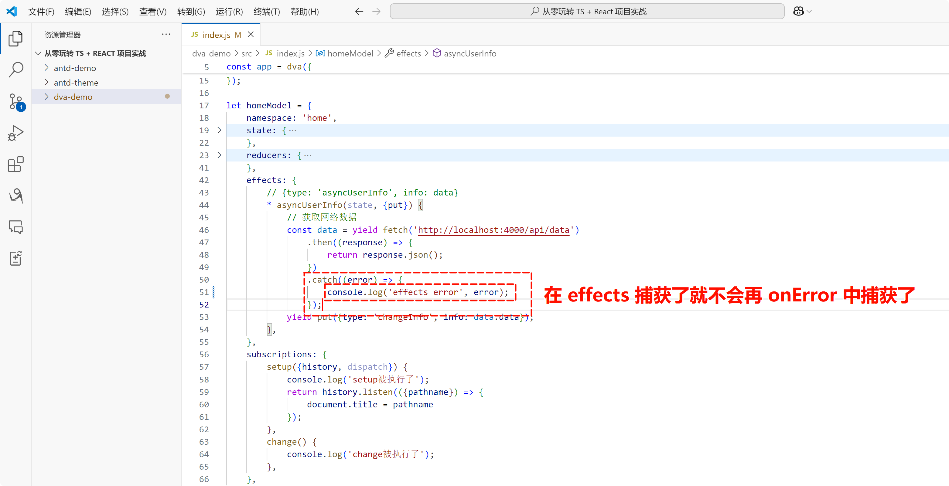 验证了 effects 中没有处理异常就会进入全局,这个时候我头脑一思考,发现还可以做一个测试,那么就是如果我将 .catch() 中的错误处理代码加上,然后再演示一下,流程是不是就只会走 .catch() 中的错误处理代码,不会走全局 onError 了呢?发现并不是这样就引发出了上面的问题。