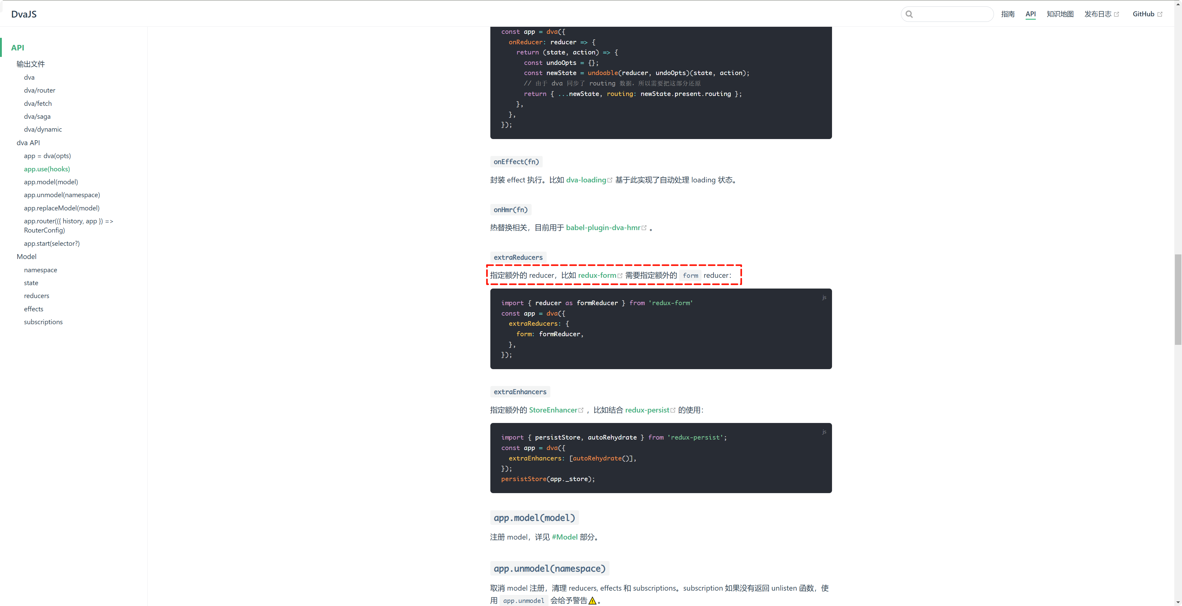 了解什么呢?打开官方文档:https://dvajs.xiniushu.com/api/ 进入到 API 栏目,我们可以看到 Dva 的 API 列表,这里我要找的是 app = dva(opts),这个 API 用来创建一个 Dva 实例。在这个 API 当中,我们可以看到有一个 opts 参数,这个参数是一个对象,里面包含了很多配置项,这些配置项就是我们接下来要学习的内容。