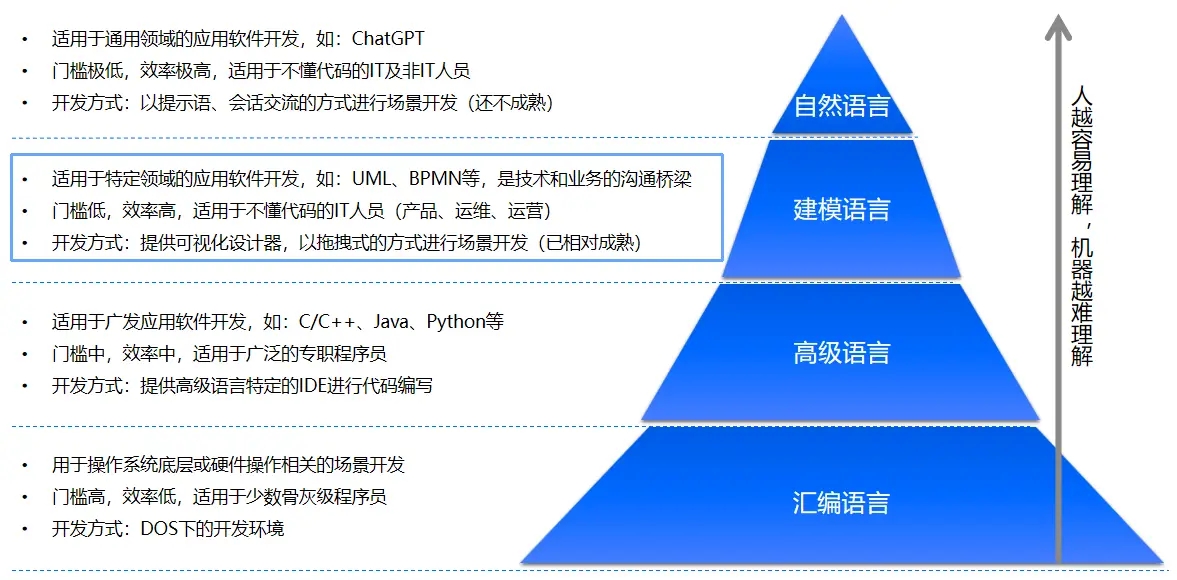 通过和专业的代码开发做对比,低代码、零代码本质是提供了一种更抽象的“开发语言”。通过图1能看到,低代码、零代码是建立在一种“建模语言”之上的,相对汇编、高级开发语言,建模语言的抽象程度更高,所以对开发者的门槛更低,只要熟悉图形的含义,就可以通过可视化的方式拖拽出符合业务逻辑的程序。BPMN是一种比较成熟的流程建模语言,专门用于业务流程领域的业务场景构建。这也是为什么很多低代码产品能够在“偏流程管理型”的应用场景中获得成功的原因,除了市场有需求之外,技术层面有成熟的理论支撑也很重要。