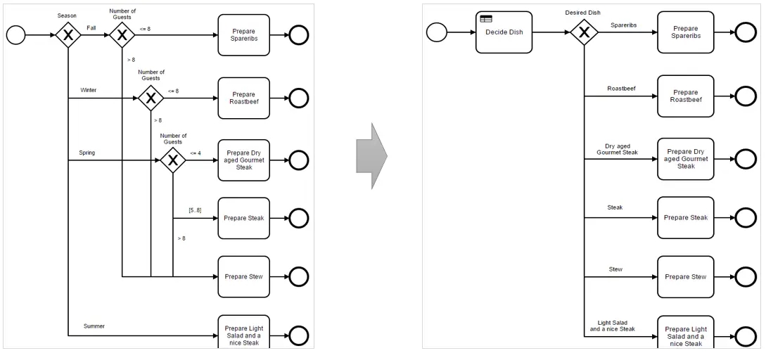 管理过程中还有一个很重要的活动就是决策,不同的决策结果会影响后续的工作流程。例如:某个变更是否要执行,就需要人为判断变更的风险程度来决定后续的处理策略。针对此类决策的活动场景,最佳实践则是通过DMN标准来进行描述。通过下图对比可以直观看出在决策场景中用与不用DMN的区别。