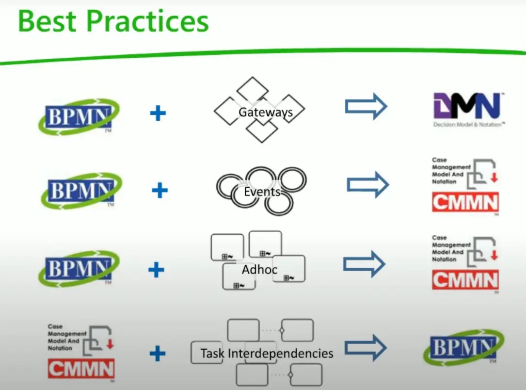 如前面章节所述,在流程建模过程中,不同的标准适用于不同的场景。那具体到一个完整流程的设计,应该如何判断选择怎样的标准组合呢?同样行业中也提供了最佳实践的参考原则: