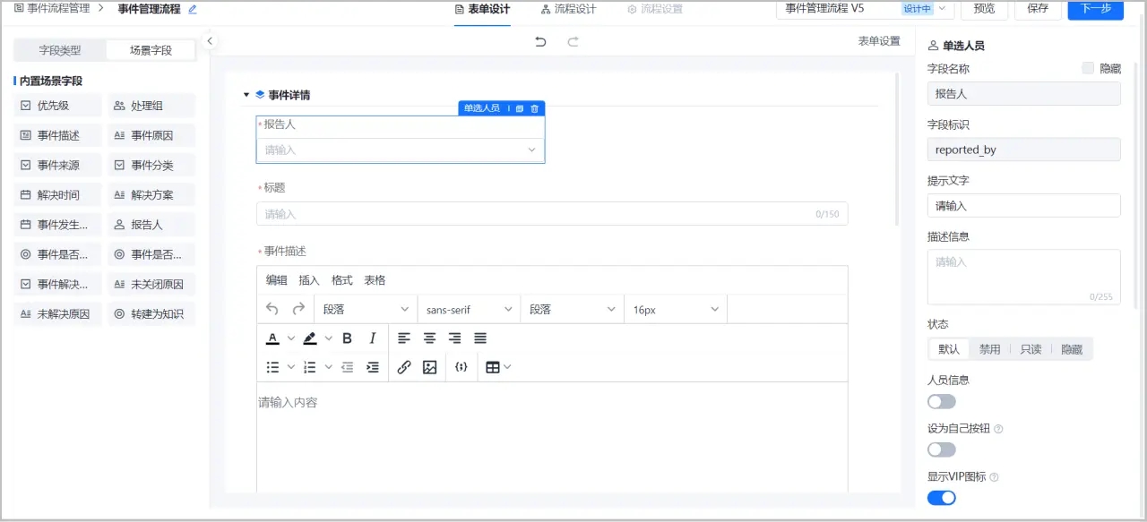 最能反映运维管理的业务逻辑的是运维工单的设计,细节到一个事件优先级的定义、问题类别的定义等,都能对运维工作产生影响,甚至影响到是否满足监管合规。因此,即使过了建设期,在运营期间也可能对已定义好的表单进行细微调整,此时ITSM表单的灵活性就非常重要。基于表单引擎可以对运维工单进行可视化建模,包括表单字段的定义、表单字段数据来源的定义、表单字段之间交互规则的定义、表单字段之间数据联动规则的定义等,以应对表单频繁变化的场景。常见的应用场景如下: