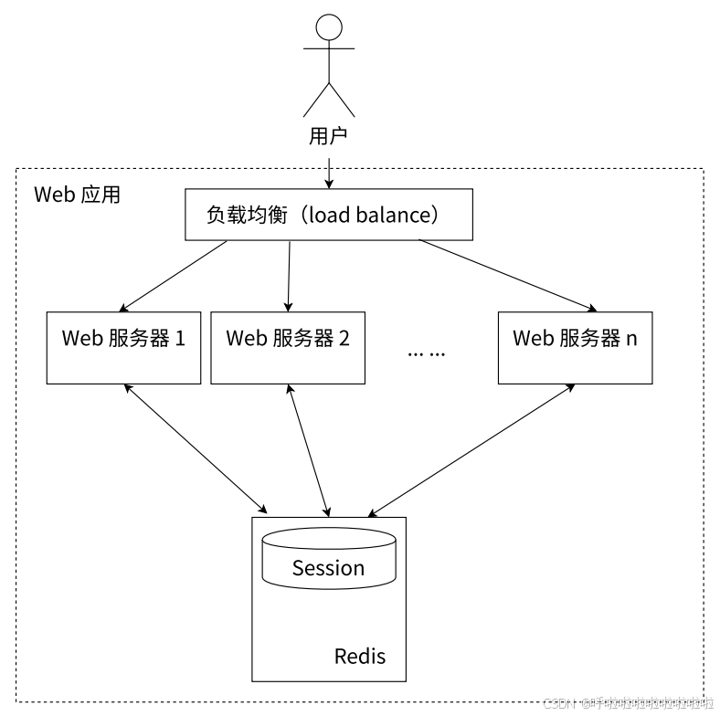 使用 Redis 将用户的 Session 信息进⾏集中管理,如图所示,在这种模式下,只要保证 Redis 是高可用和可扩展性的,无论用户被均衡到哪台 Web 服务器上,都集中从 Redis 中查询、更新 Session 信息。