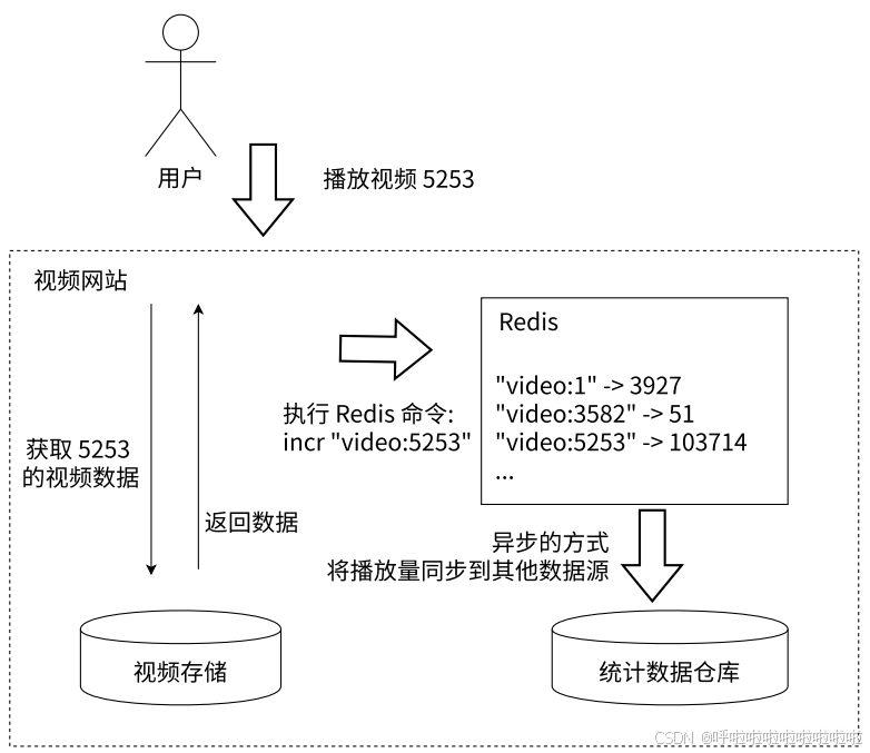 }许多应用都会使用 Redis 作为计数的基础⼯具,它可以实现快速计数、查询缓存的功能,同时数据可以异步处理或者落地到其他数据源。如图所示,例如视频网站的视频播放次数可以使⽤ Redis 来完成:用户每播放⼀次视频,相应的视频播放数就会自增 1。