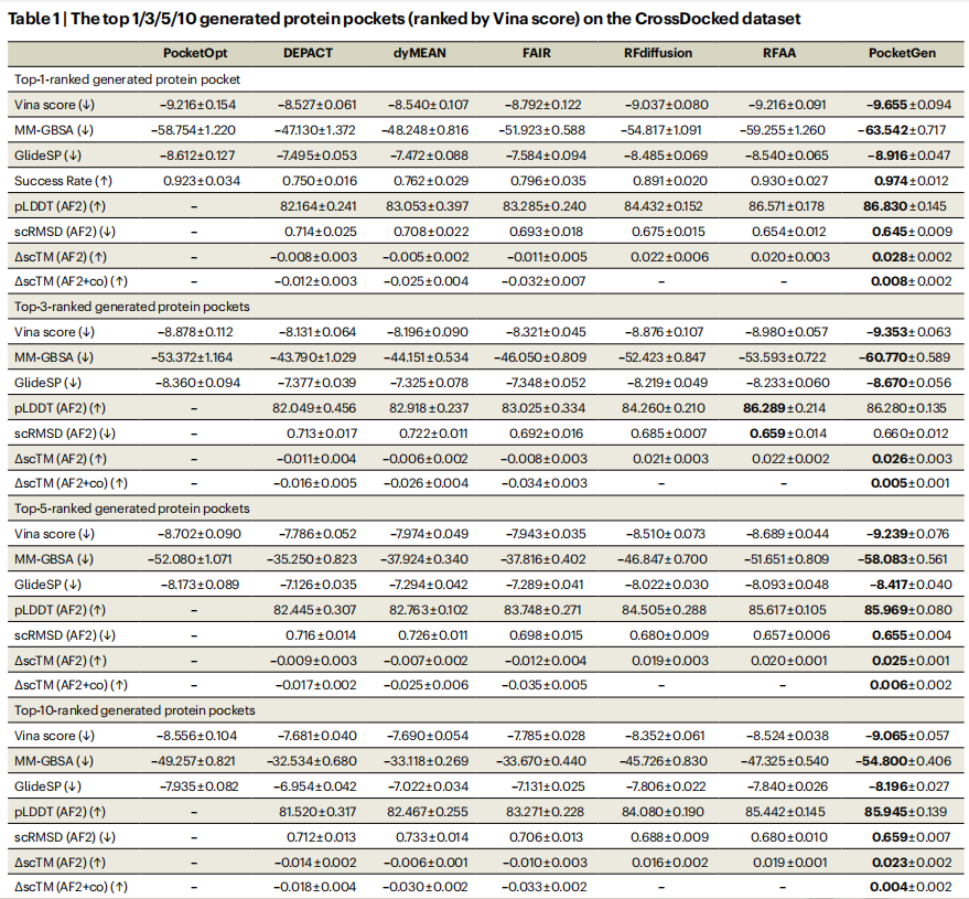 测试中使用了三类指标:1. 结合亲和力(AutoDock Vina分数、MM-GBSA和GlideSP);2. 结构有效性(scRMSD、scTM和pLDDT);3. 序列准确性(AAR)。这些指标用于评估生成蛋白口袋在结构和功能上的质量。