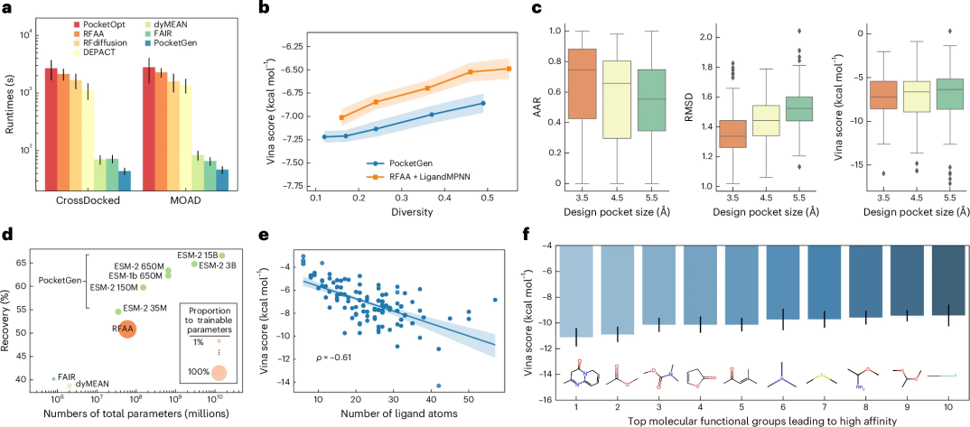 图 3c研究了口袋大小对性能的影响。设计区域扩大至5.5 Å时,AAR和Vina分数稍有下降,但较大的口袋展现出更高的亲和力潜力,说明其在复杂设计任务中的优势。PocketGen的性能得益于蛋白语言模型的集成(图3d)。随着 pLM 参数规模从8M增至15B,模型表现从54.58%提升至66.61%。PocketGen通过适配器层实现高效训练,仅需7.9M可训练参数,而 RFAA 需 82.9M。配体分子特性对性能也有影响。图3e显示,PocketGen在较大配体分子上生成了更高亲和力的口袋,这与更大的交互表面积和更多功能基团有关。通过IFG方法,图3f确认了关键基团(如氢键供体/受体和芳香环)对提升亲和力的重要作用。