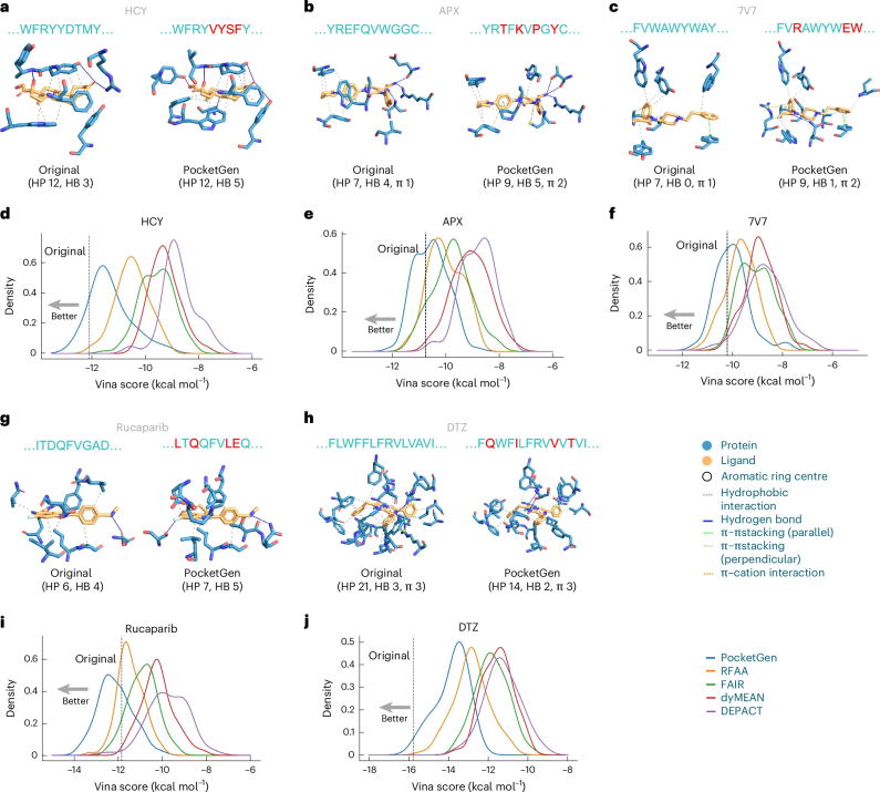 为了验证其泛化能力,PocketGen在未见蛋白(如PiB21和luxsit8)及其配体(如rucaparib 和DTZ)上表现出色(图4g–j),生成的高亲和力口袋持续优于其他方法。即使是原始设计经过饱和突变优化的DTZ,PocketGen仍表现出强适应性。此外,案例研究显示,PocketGen能灵活调整相互作用模式,包括氢键、疏水接触和卤键,从而针对不同分子片段设计高亲和力口袋。