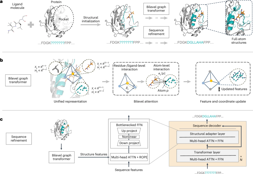 近年来,基于深度学习的方法显著推动了蛋白结合位点设计的发展。例如,RFdiffusion结合扩散模型与RoseTTAFold生成蛋白结构,但在模拟复杂的蛋白-配体相互作用方面仍存在不足。改进版本RFAA通过迭代去噪生成结合蛋白,但其后处理步骤容易导致序列与结构间不一致。而FAIR通过两阶段精炼方法同时设计原子结构和序列,但阶段间的不稳定性限制了性能。这些问题表明需要一种端到端生成方法来提高设计效率和一致性。混合方法结合了深度学习与传统技术,例如通过trRosetta生成骨架结构,结合ProteinMPNN和AlphaFold进行序列设计和筛选。这些方法尽管取得了一定进展,但在实现序列与结构一致性及模拟复杂相互作用方面仍面临挑战。
